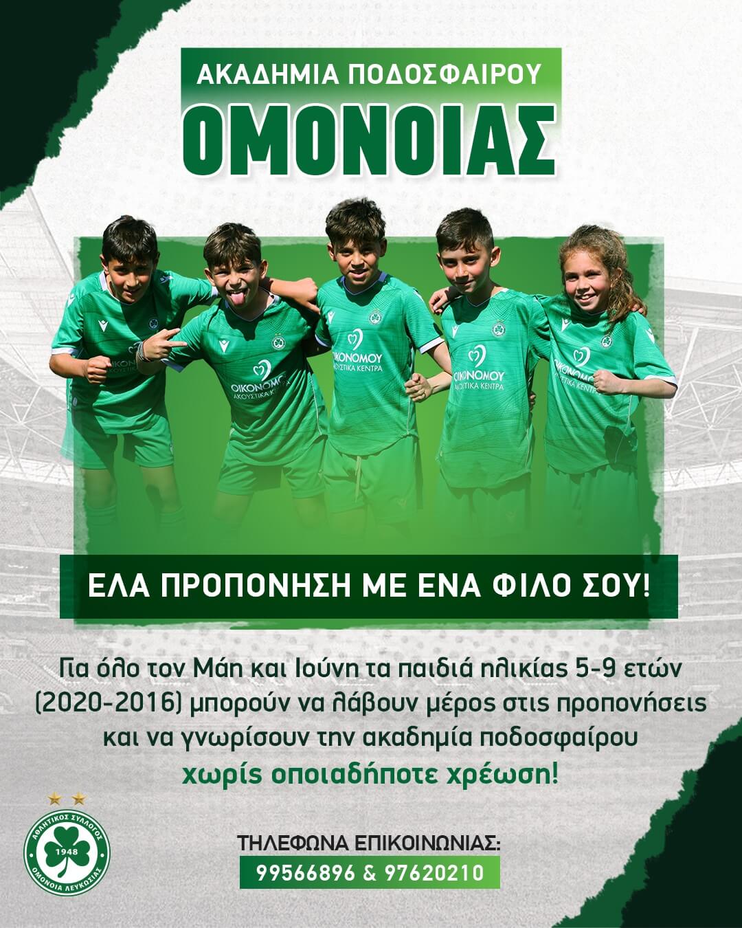 Συγκεκριμένα, τους μήνες Μάιο και Ιουνίου, τα παιδιά ηλικίας 5 μέχρι 9 χρόνων (2020-2016) μπορούν να λάβουν μέρος στις προπονήσεις και να γνωρίσουν την ακαδημία ποδοσφαίρου της ΟΜΟΝΟΙΑΣ χωρίς οποιαδήποτε χρέωση!