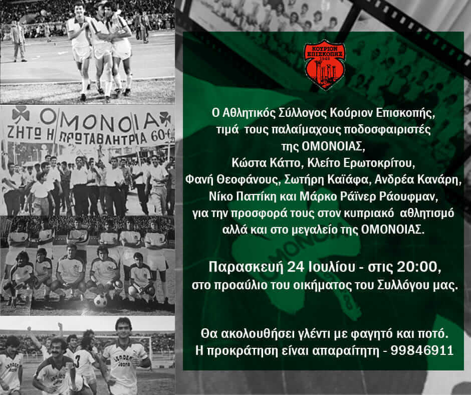 Εκδήλωση προς τιμή των παλαίμαχων ποδοσφαιριστών μας Κώστα Κάττο, Κλείτο Ερωτοκρίτου, Φανή Θεοφάνους, Σωτήρη Καϊάφα, Ανδρέα Κανάρη, Νίκο Πατίκκη και Ράϊνερ Ράουφμαν θα πραγματοποιήσει ο Αθλητικός Σύλλογος Κούριον Επισκοπής.