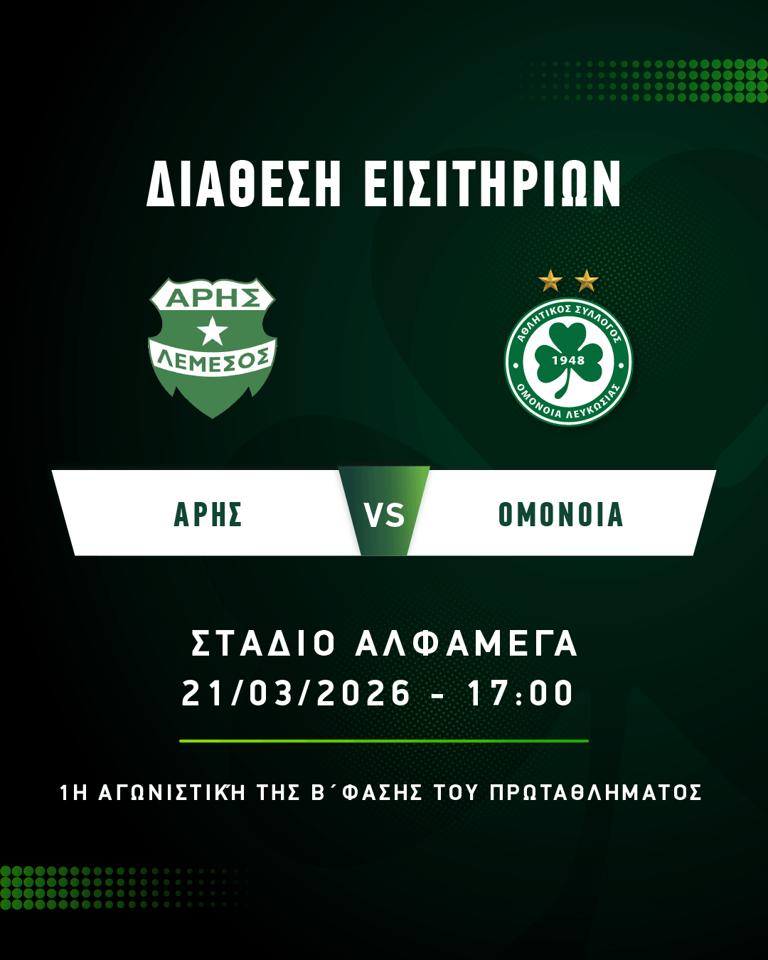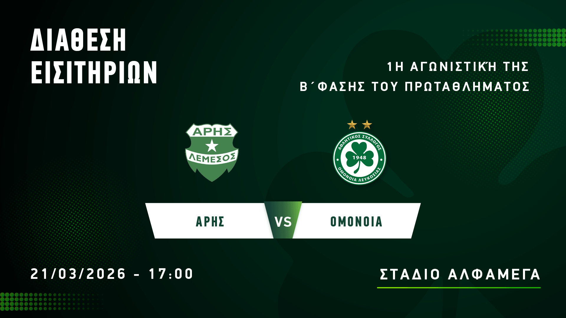 Από την Τρίτη 17 Μαρτίου, στις 14:00, διατίθενται τα εισιτήρια για τον εκτός έδρας αγώνα με τον Άρη Λεμεσού, που θα διεξαχθεί στο στάδιο ΑΛΦΑΜΕΓΑ το Σάββατο (21/03, 17:00), στο πλαίσιο της 1ης αγωνιστικής της Β’ φάσης του πρωταθλήματος.