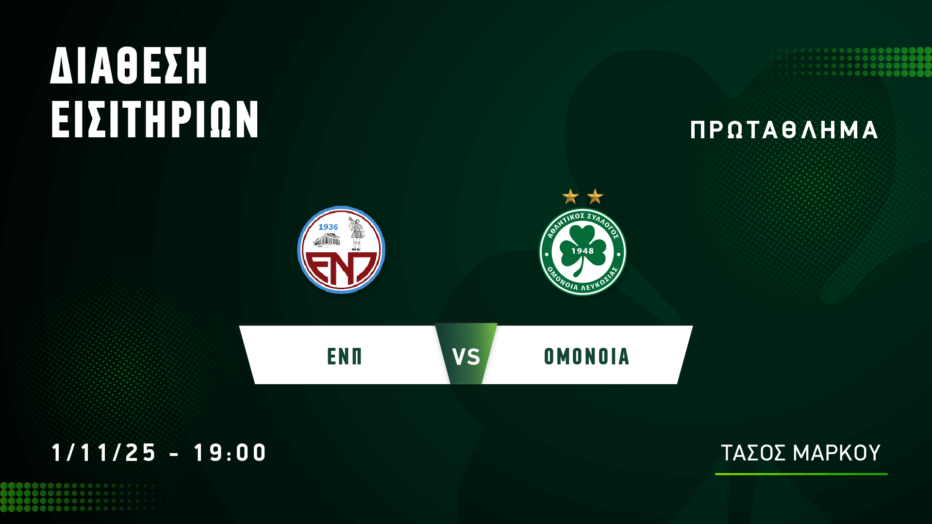 Από την Τετάρτη, 29 Οκτωβρίου, στις 10:00, διατίθενται τα εισιτήρια για την 9η αγωνιστική του πρωταθλήματος με αντίπαλο την Ε.Ν.Π στο στάδιο «Τάσος Μάρκου».