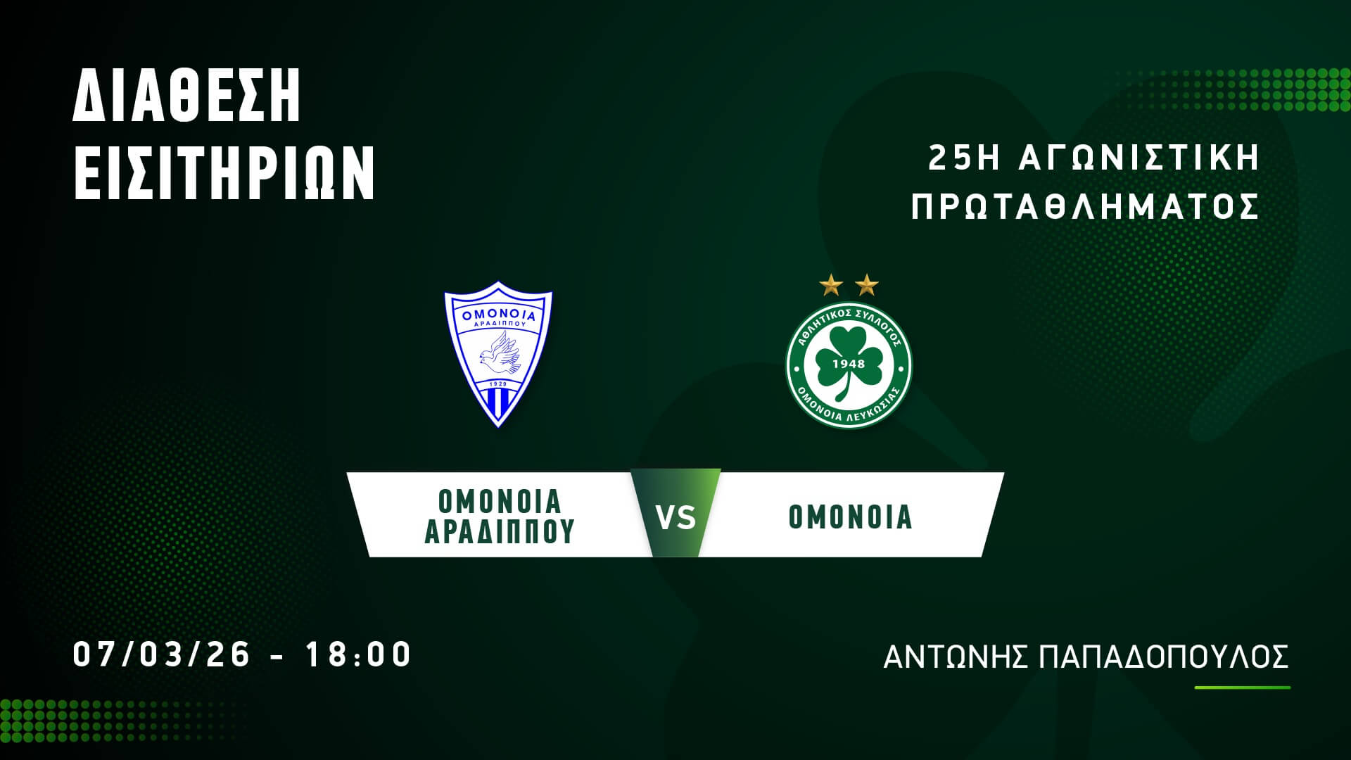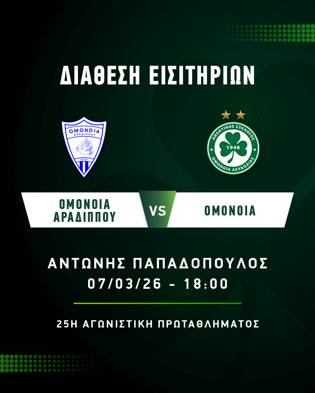 Από την Τρίτη 3 Μαρτίου, στις 14:00, διατίθενται τα εισιτήρια για την 25η αγωνιστική του πρωταθλήματος με αντίπαλο την Ομόνοια Αραδίππου στο στάδιο «Αντώνης Παπαδόπουλος».