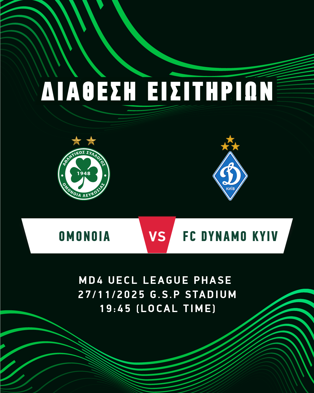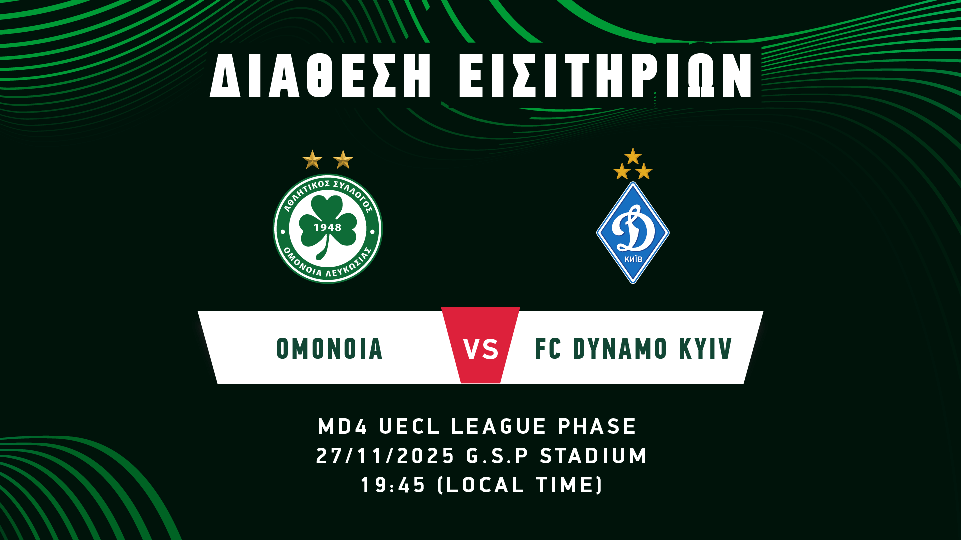 Από την Πέμπτη, 20 Νοεμβρίου, στις 14:00, διατίθενται τα εισιτήρια για τον αγώνα με την FC DYNAMO KYIV στο πλαίσιο της 4ης αγωνιστικής της League Phase του UEFA Conference League, ο οποίος θα διεξαχθεί την Πέμπτη, 27 Νοεμβρίου, στο στάδιο ΓΣΠ και θα αρχίσει στις 19:45.