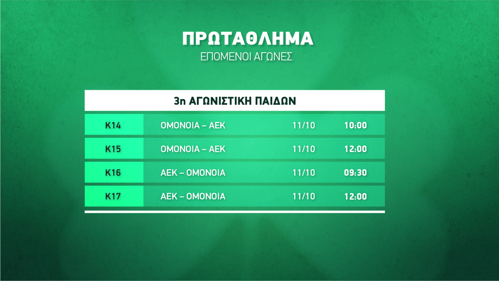Στα Κορίτσια, η ομάδα Κ15 αντιμετωπίζει εκτός έδρας τον Απόλλωνα την Κυριακή στις 10:00 και η ομάδα Κ18 παίζει επίσης με τον Απόλλωνα, εντός έδρας, το Σάββατο στις 10:00.
