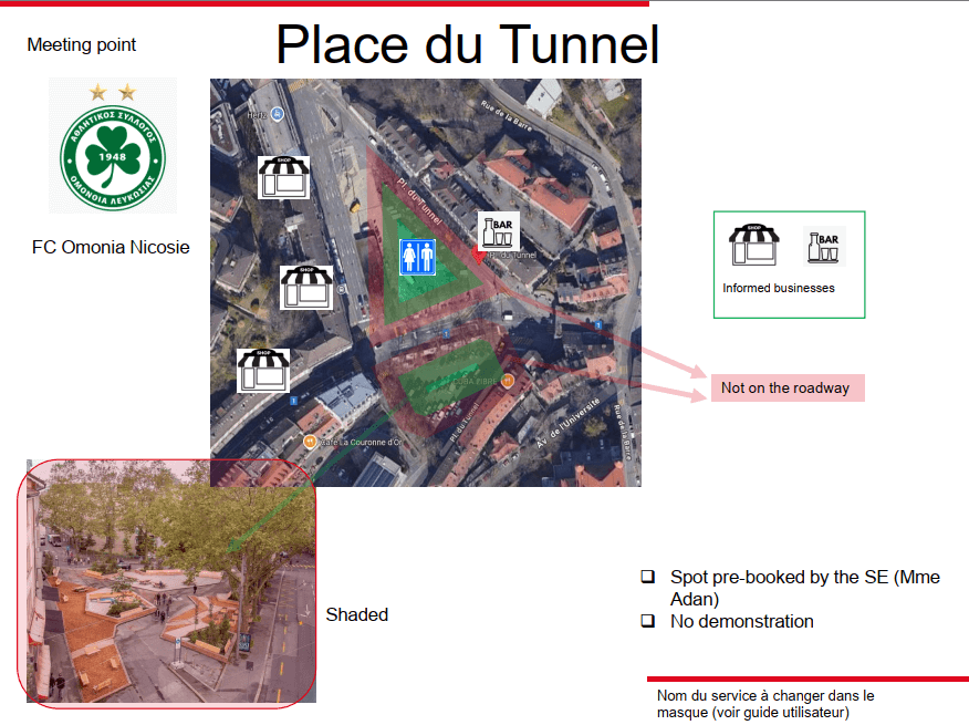 Σημείο συνάντησης φιλάθλων Place du Tunnel. Από το σημείο θα υπάρχει οργανωμένη μετακίνηση προς το γήπεδο με συνοδεία από την αστυνομία η οποία θα αρχίσει στις 19:00.