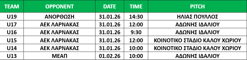 Τα κορίτσια της Κ18 παίζουν το Σάββατο στις 10:00, εκτός έδρας με την Πάφο. Εκτός έδρας παίζουν και τα κορίτσια της Κ15, αντίπαλο την ΑΕΛ, την Κυριακή στις 12:00.
