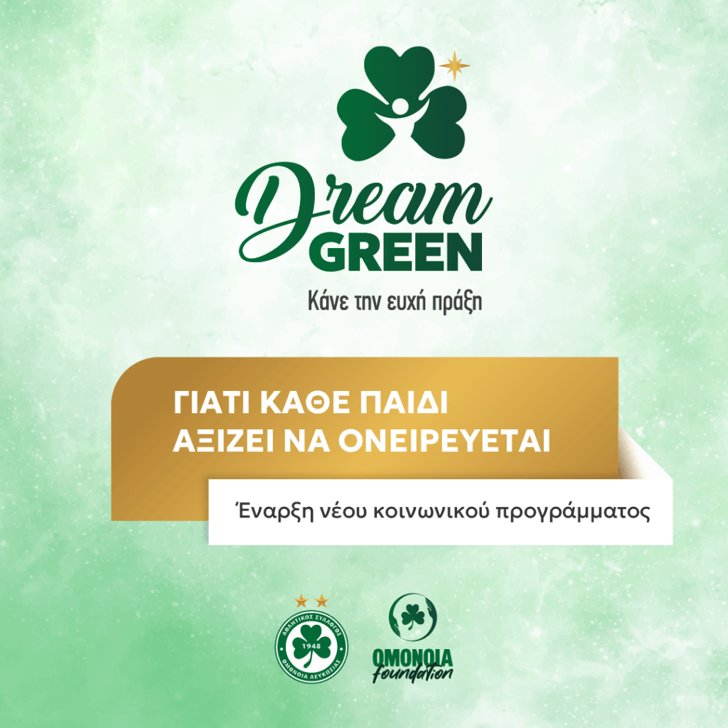 Το Dream Green – Κάνε την Ευχή Πράξη είναι μια νέα πρωτοβουλία κοινωνικής προσφοράς του OMONOIA Foundation, εμπνευσμένη από τη φιλοσοφία του make-a-wish και τις αξίες του αθλητισμού.